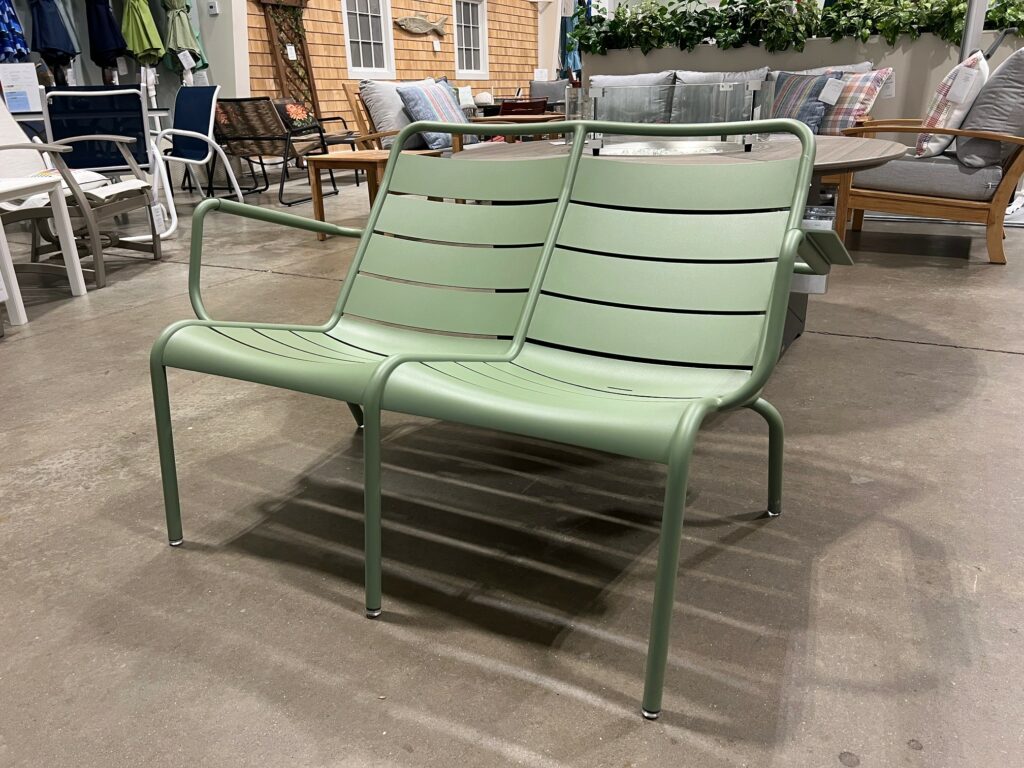 Green finish. Last one in stock. Stylish loveseat with a contemporary design. Made from aluminum. Low maintenance and durable.