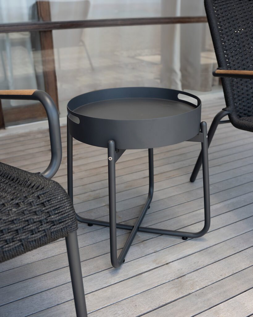 Powder coated aluminum end table with a removeable tray, so you can easily bring drinks or snacks outdoors from the kitchen.
