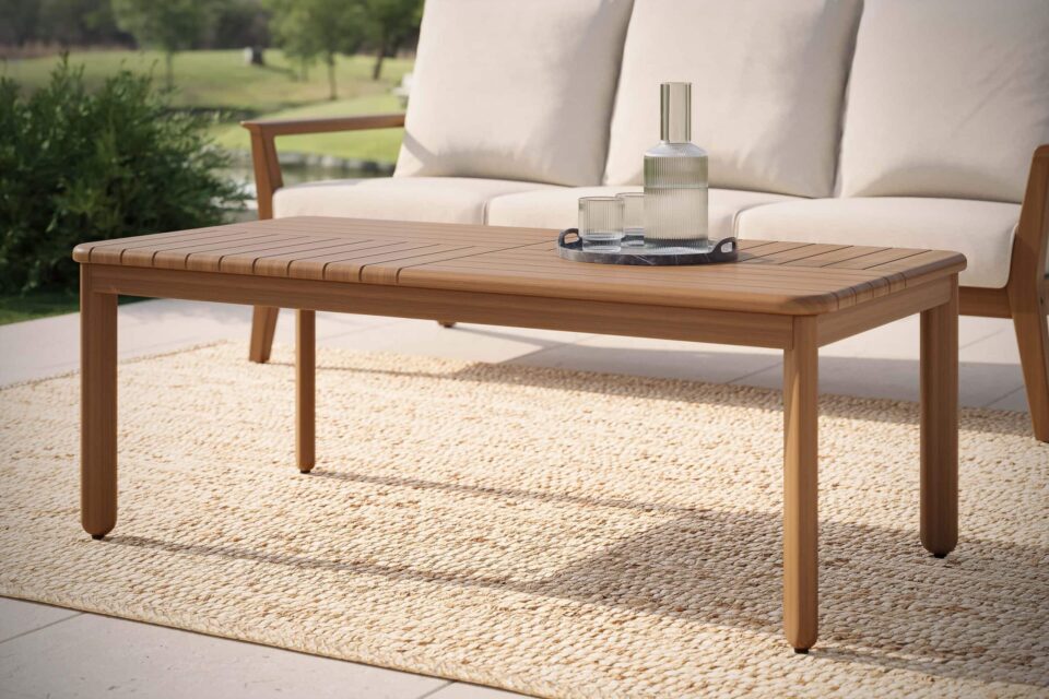 Ipe coffee table with mosaic inspired slatted top design. Generous size for in front of a sofa or sectional. Made from durable, sustainably sourced Ipe timber.