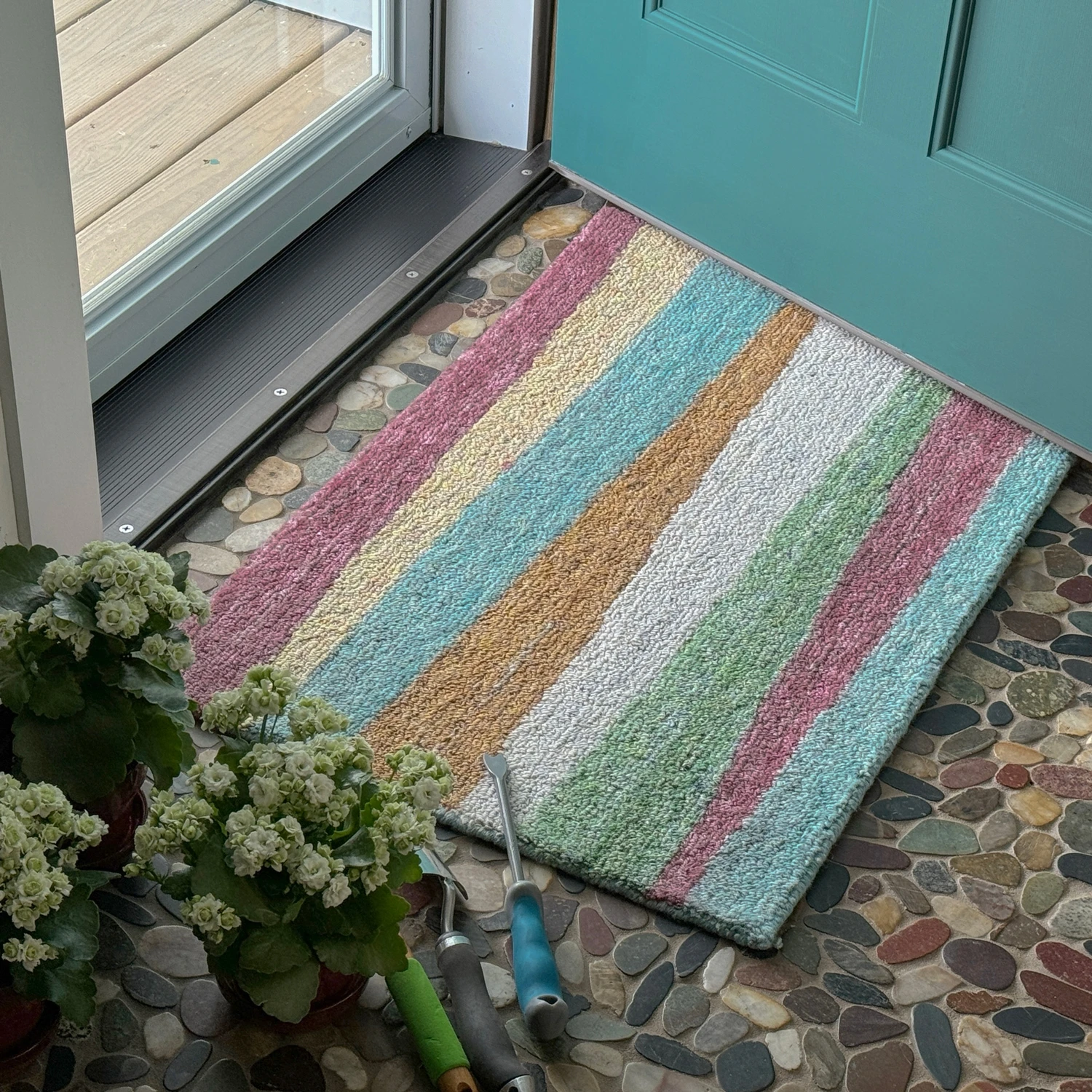 100% post-consumer recycled polyester pile certified to the Global Recycled Standard. Hand-tufted, 5/8″ loop pile. Solution-dyed yarns. Made in India. GoodWeave certified.
