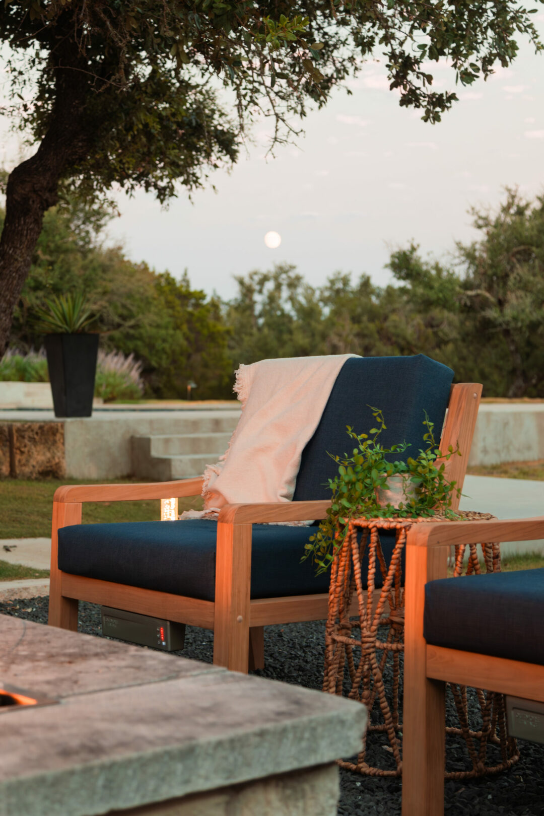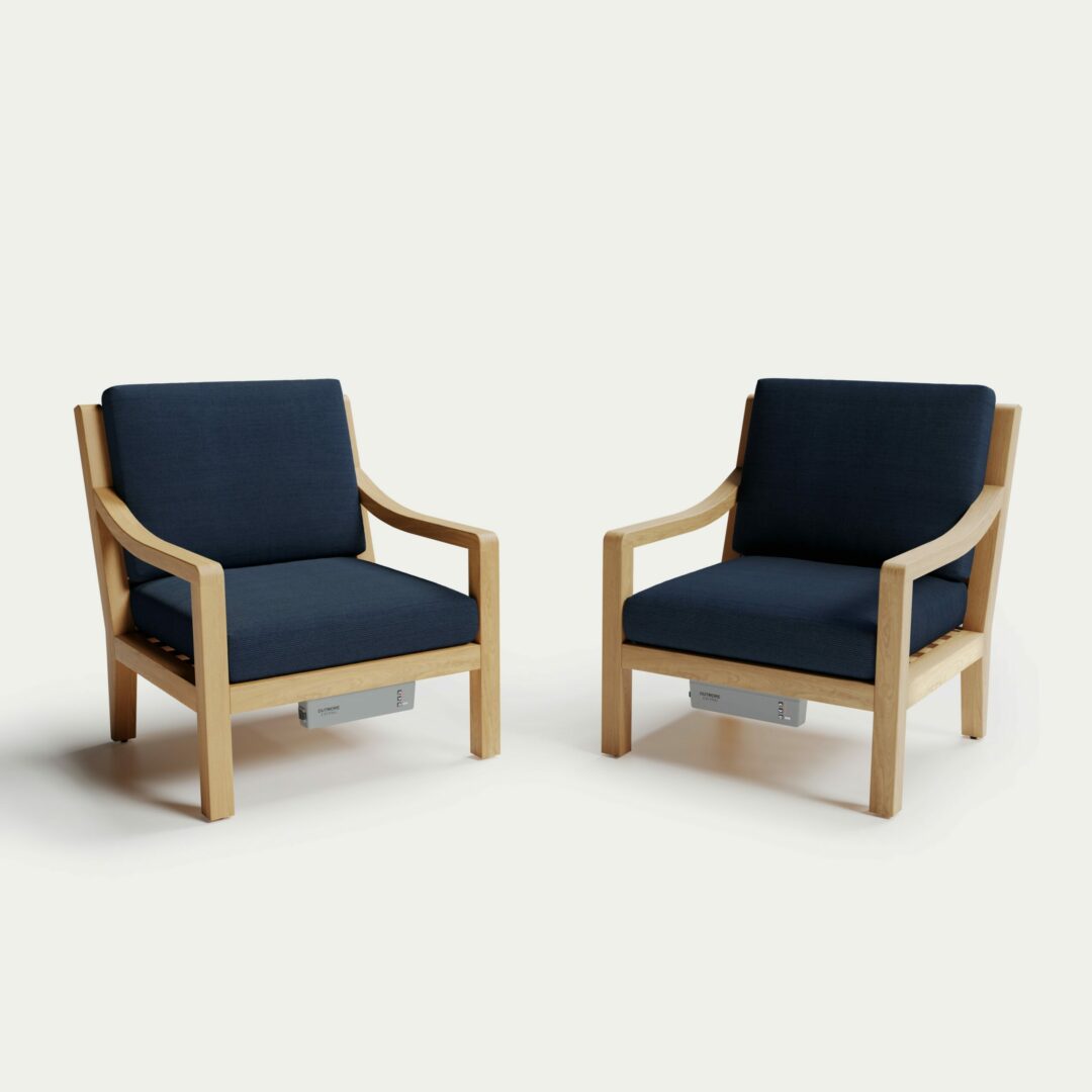 This lounge chair is made from premium materials. Durable teak and Sunbrella fabric and waterproof electronics and heating elements. Heats up in 60 seconds. There are 5 heat settings that range in temperature from 85-120 degrees. Battery is magnetic so it can be easily removed for charging. The teak is sustainably sourced. Enjoy with outdoors year-round with a new Outmore Living set!