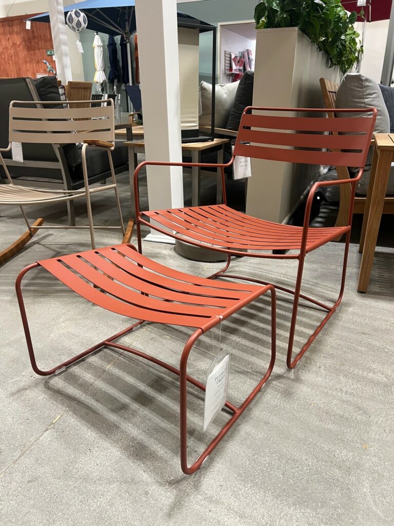 Red chair and ottoman. Made from steel. Ottoman slides under chair for when it is not in use. Contemporary and stylish. Low maintenance.