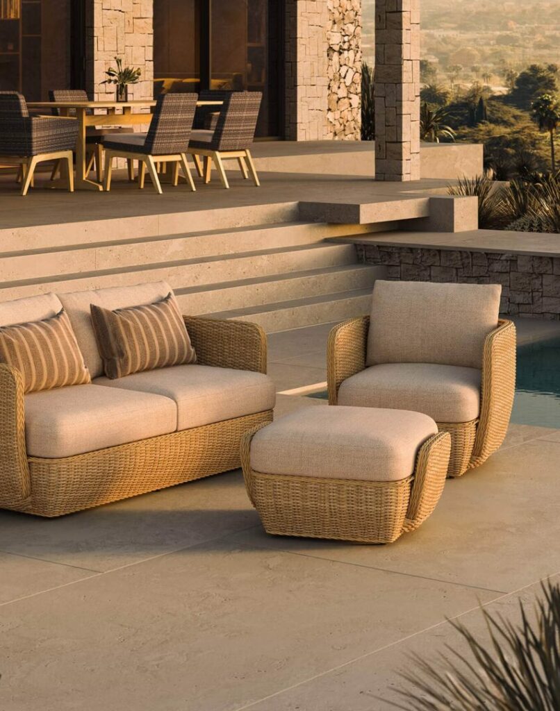 Jensen Outdoor is introducing the new Velo collection. A modern take on wicker outdoor furniture. Its rounded shape and thick, wide cushions give it a really cool and updated look. The frame is constructed of powder coated aluminum and then it is wrapped in handwoven Solara fiber. The backrest is at a nice angle for relaxing for long periods of time. Cushions are made with durable Sunbrella fabric.