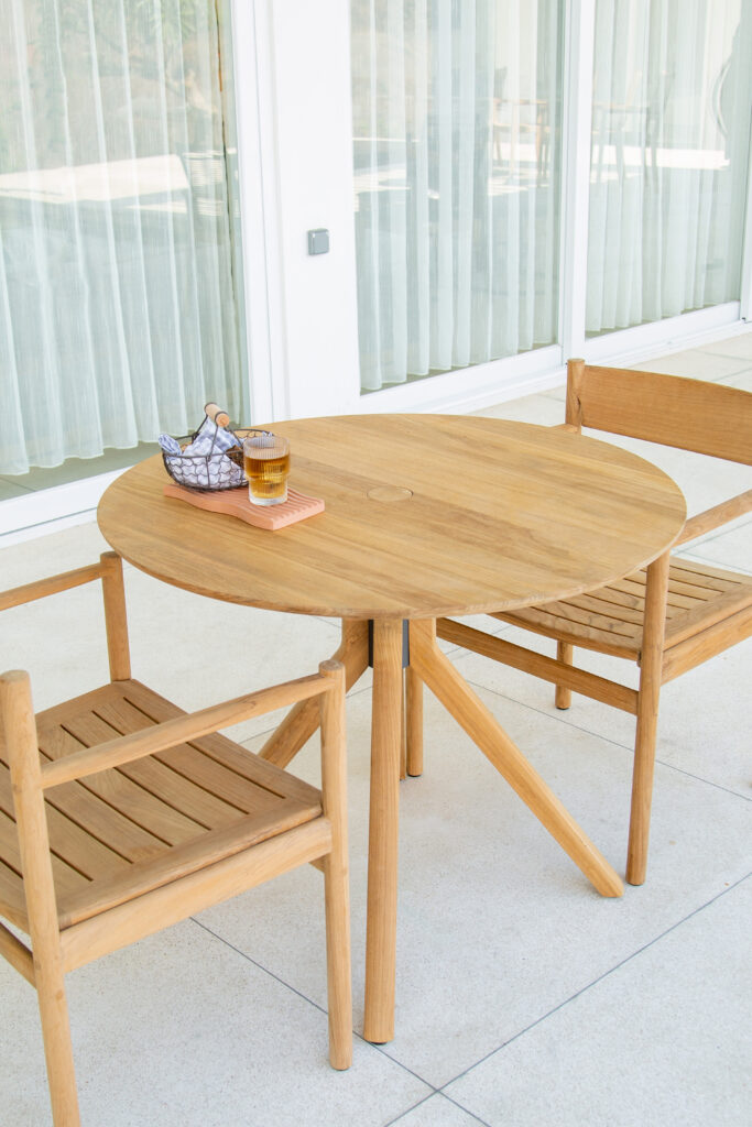 The Vinalhaven Bistro Table features a solid teak top which gives it a different look as most teak tables are slatted. This is a small table for a couple people to enjoy a meal or drink or even just have a conversation. Made from grade A teak timber.