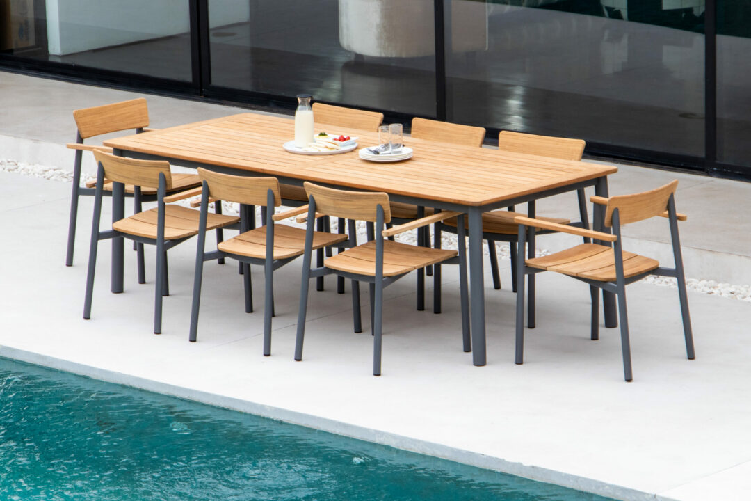 The Vinalhaven Dining Chair is a stackable, modern looking chair made from grade A teak and powder coated aluminum. It features a seat with three slats and a single slatted back. It pairs well with a Vinalhaven Dining Table.