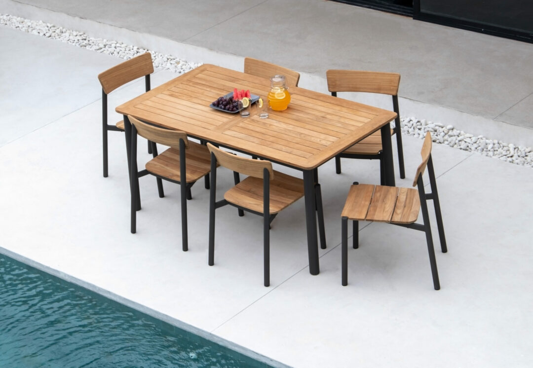 The Vinalhaven side chair is a stackable, modern looking chair made from grade A teak timber and an aluminum powder coated frame. It features a three-slat seat and a single slatted back.